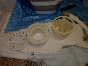 続いて洗濯繊維汚れ等が溜まるトラップ内の部品を取り出し、掃除洗浄を行ないました。