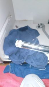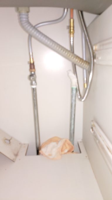 お客様ご自身で台所の蛇口を交換しようとしたところ、シンク下にある止水栓を折ってしまい、台所を水浸しにしてしまったとのことです。