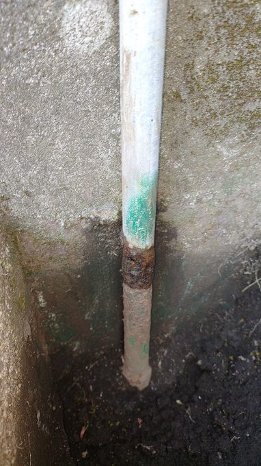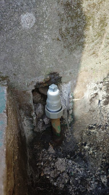 確認したところ、屋外蛇口の給水管が経年劣化により破損し、穴が空いてしまっていました。家全体の水を止めなければならない状況であったため、今回は屋外蛇口を止水する対応となりました。