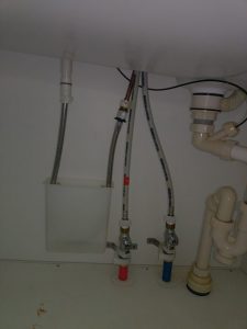 家全体の止水栓、お湯・水の止水栓を止めて給水配管を外した後、蛇口のレバー側と吐水側の固定ナットを緩め、洗面蛇口を取り外します。