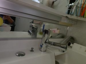 15年ほど経過しており、シャワーヘッドの水の出も均一に出て来なくなった…。とのことで、お客様、お子様共に洗面化粧台の使い方をご相談の上、シンプルなシングルタイプの蛇口に交換することとなりました。