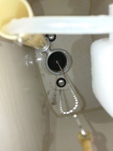 便器への水漏れはレバーを引いた時にチェーンがガイドに引っかかることが原因でした。そこでレバーを軸の長い物へ交換いたしました。