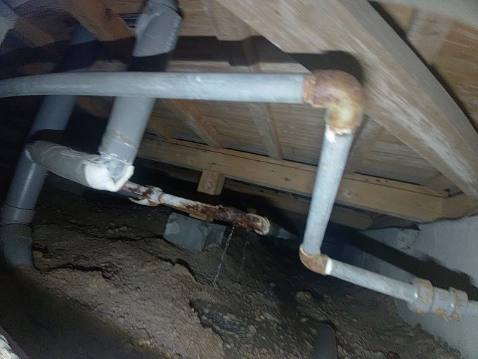 以前から漏水があるとのことで、お伺いしました。漏水箇所を探るため点検を進めたところ、床下給湯管の鉄管が錆び腐食しており、水漏れがおきていました。