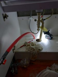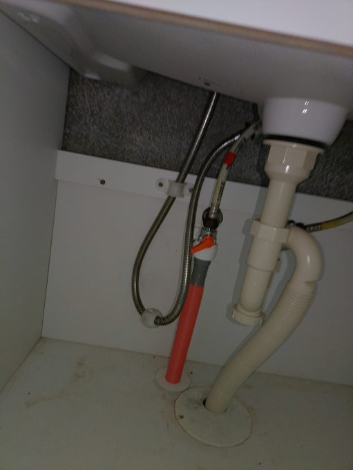 給湯配管が鉄管であったため、給湯機から台所、洗面の蛇口の湯側まで架橋ポリエチレン管で繋ぎ直す事となりました。