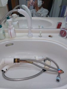 15年ほど使用している洗面台でシンク下の扉の中へ水漏れしているとご連絡をいただきました。点検の結果、蛇口のシャワーホースが劣化して破れていることがわかりました。