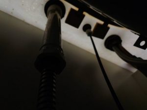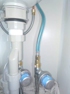 15年ほど使用している洗面台でシンク下の扉の中へ水漏れしているとご連絡をいただきました。点検の結果、蛇口のシャワーホースが劣化して破れていることがわかりました。