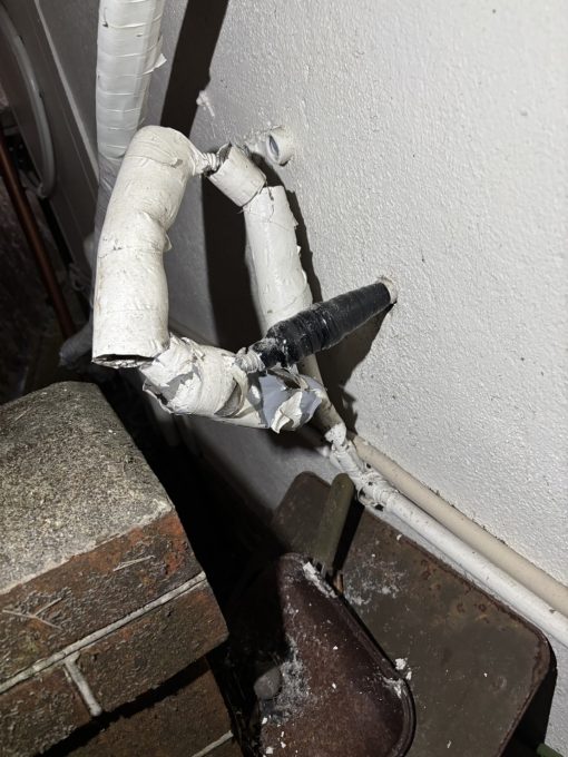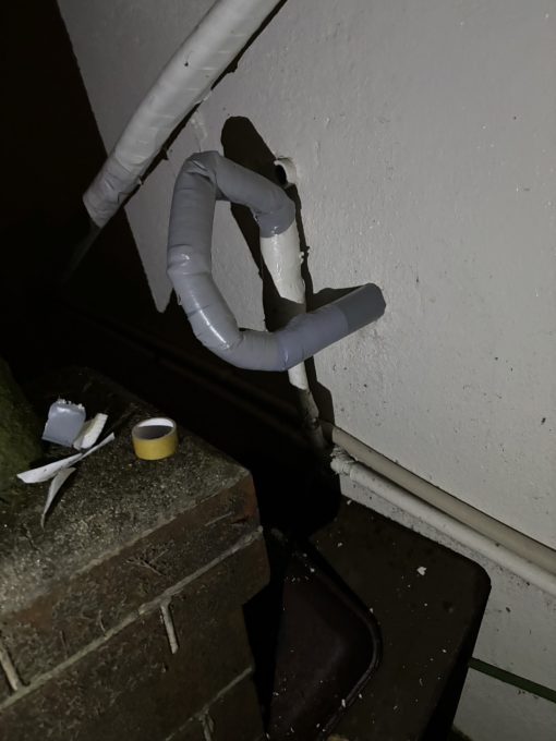 屋外の給湯管からの水漏れでした。ここ数日寒さが続き、古い給水、給湯管の破裂、腐食による水漏れが続いております。保温も隙間が多く、冷気が入ったのかと思われます。