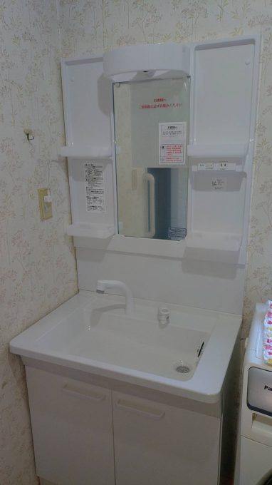 古い洗面化粧台を外し、壁と床の30年分の汚れを落として、排水管の位置を調整しながら新しい洗面化粧台を設置しました。